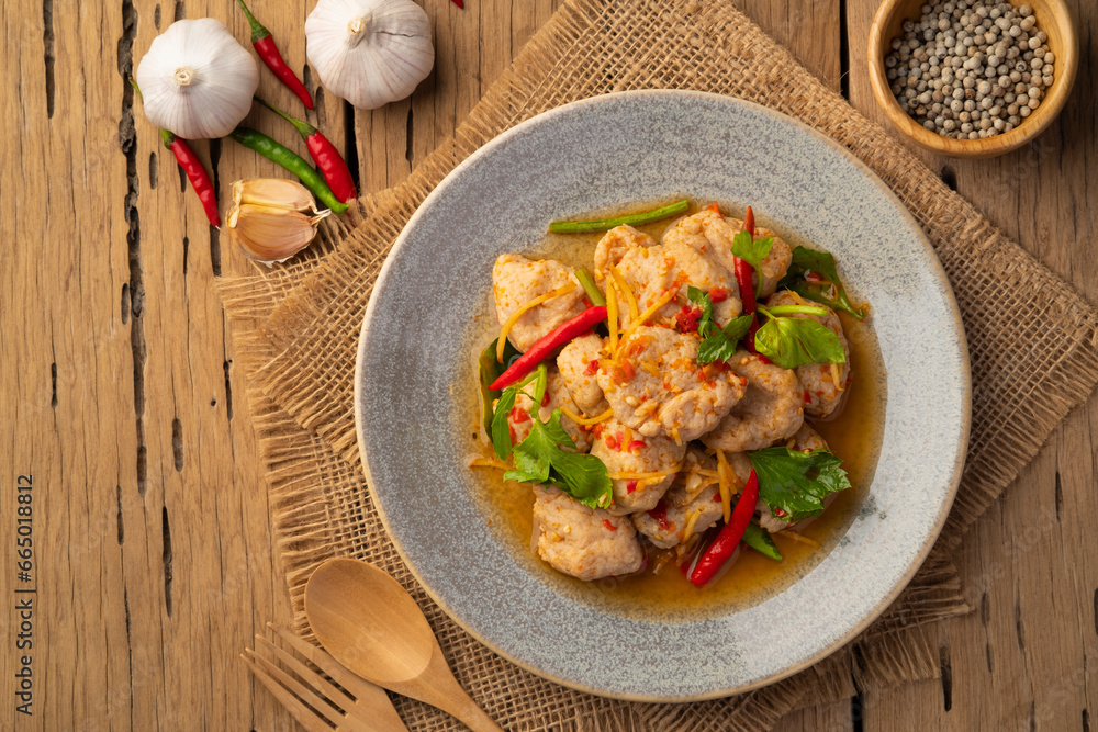 Stir Fried Spicy Fish Balls, Spicy stir fry clown featherback fishball in a plate.Top view