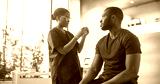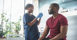 African American Man Sitting In The Chair In Hospital And Getting His Chicken Pox Vaccine. Professional Black Female Nurse Is Performing Injection And Putting A Patch On. Public Healthcare Concept.
