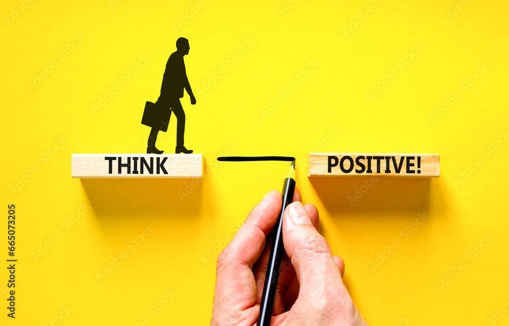 Think positive symbol. Concept words Think positive on beautiful wooden block. Beautiful yellow table background. Businessman hand. Business, motivational think positive thinking concept. Copy space.