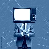 A business man with a retro television instead of a head against a blue background, surrealism.