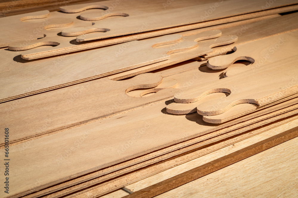 narrow panels of okoume plywood with puzzle joints in stittch-and-glue boat building kit