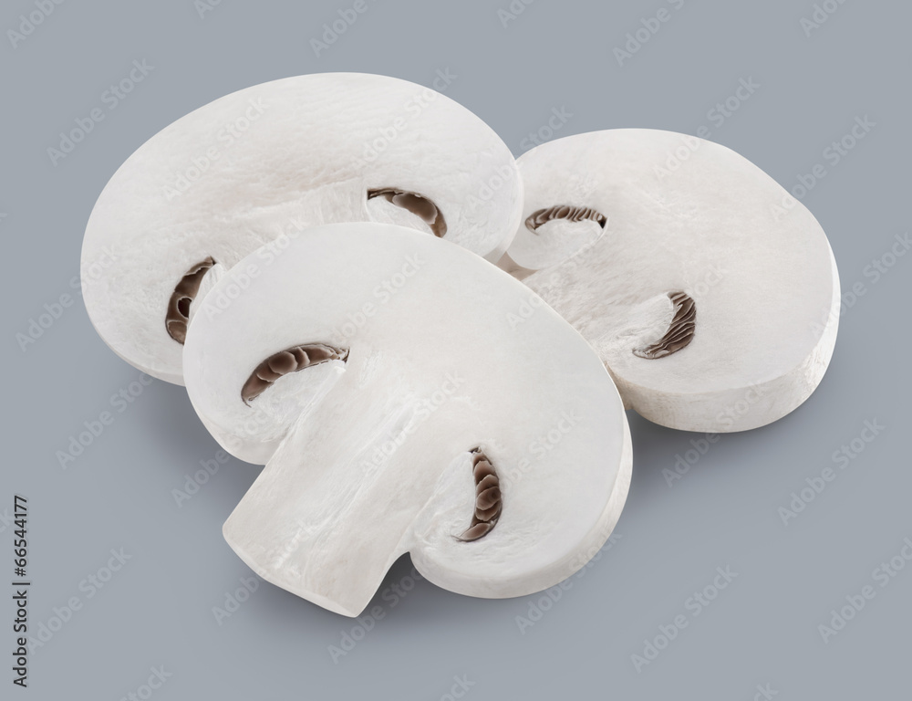 Three mushroom slices isolated on grey background