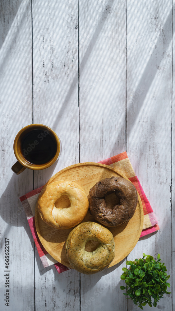 ベーグルとコーヒー|プレーン・チョコレート・ほうれん草