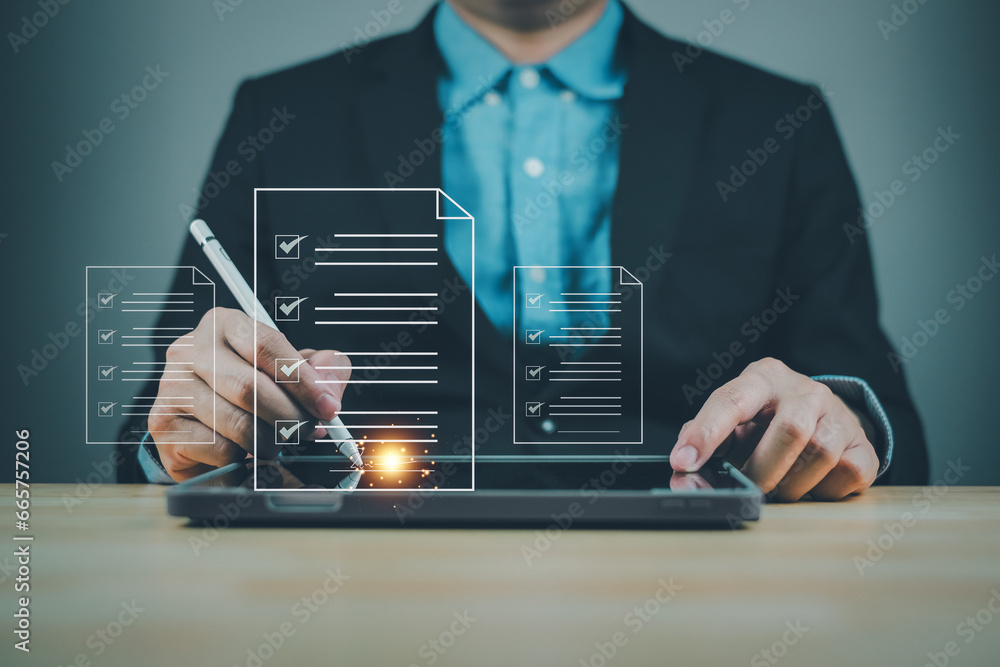 E-signature document electronic online digital e-Commerce business paperless on computer man using pen sign virtual on notebook screen