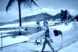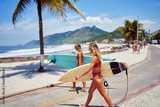 two caucasian women surfers walking on the street holding surfboards in swimsuit