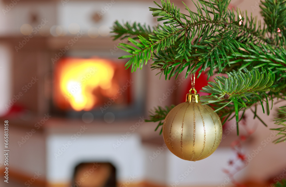 Christmas ball on fir tree branch and blur burning fireplace background.