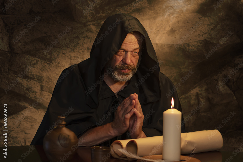 An elderly monk in a black cassock praying, hands folded in prayer, a dark cell, a candle burning on a table.