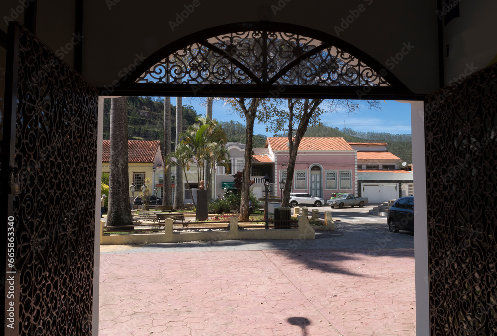 Paraibuna city square seen door frame - São Paulo, Brazil.