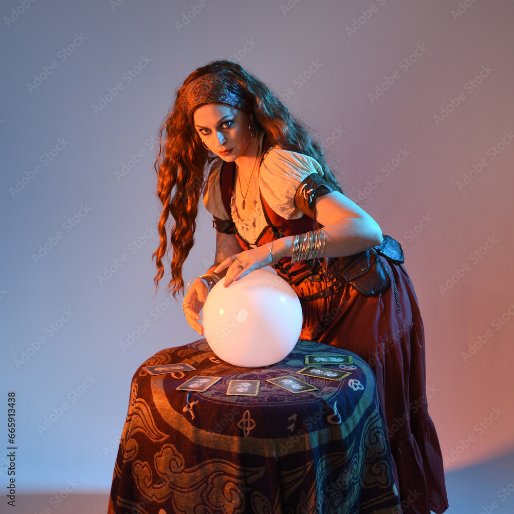 close up portrait of beautiful red haired woman wearing a medieval fantasy fortune teller costume, looking into crystal ball reading the future at seance table. isolated on studio background