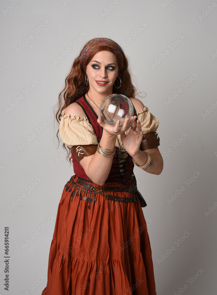 close up portrait of beautiful red haired woman wearing a medieval maiden, fortune teller costume. Posing while holding a crystal ball. isolated on studio background.