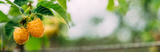 Yellow Or Golden Raspberries. Growing Organic Berries Closeup. Ripe Raspberry In Fruit Garden Panorama, Panoramic View Shot Scene Copy Space