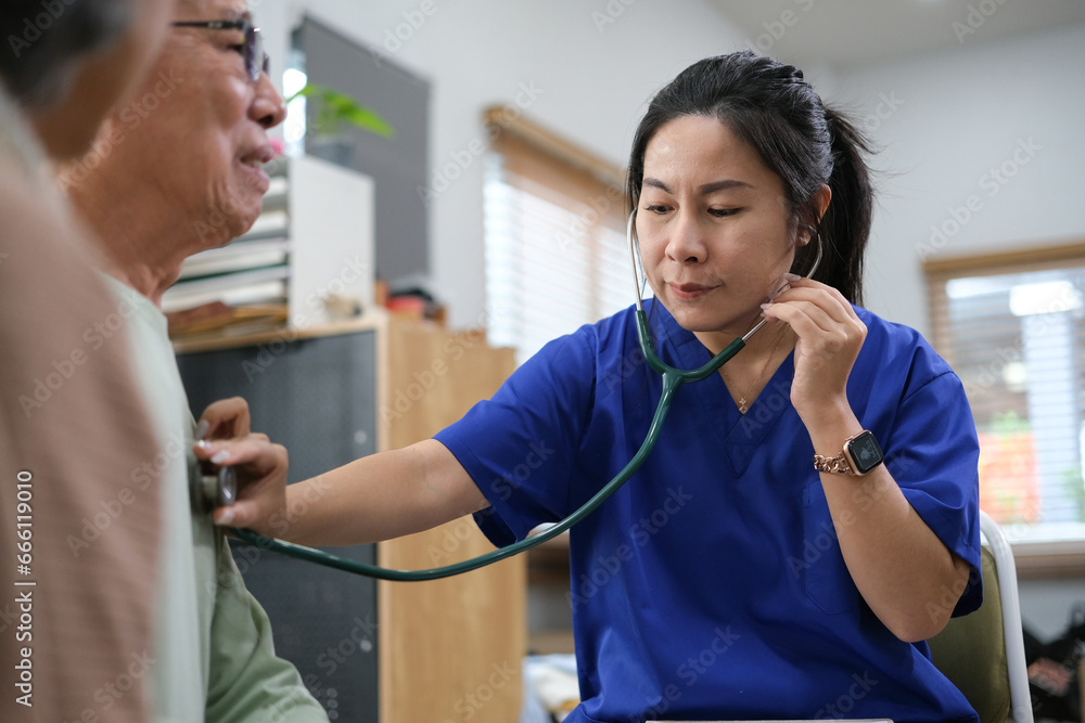 Attentive doctor or healthcare worker giving professional advice to senior couple during home visit