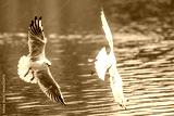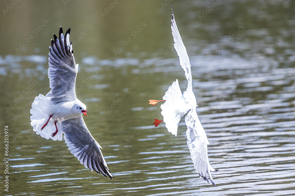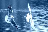 black-headed gull (Chroicocephalus ridibundus) two over water