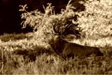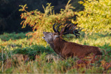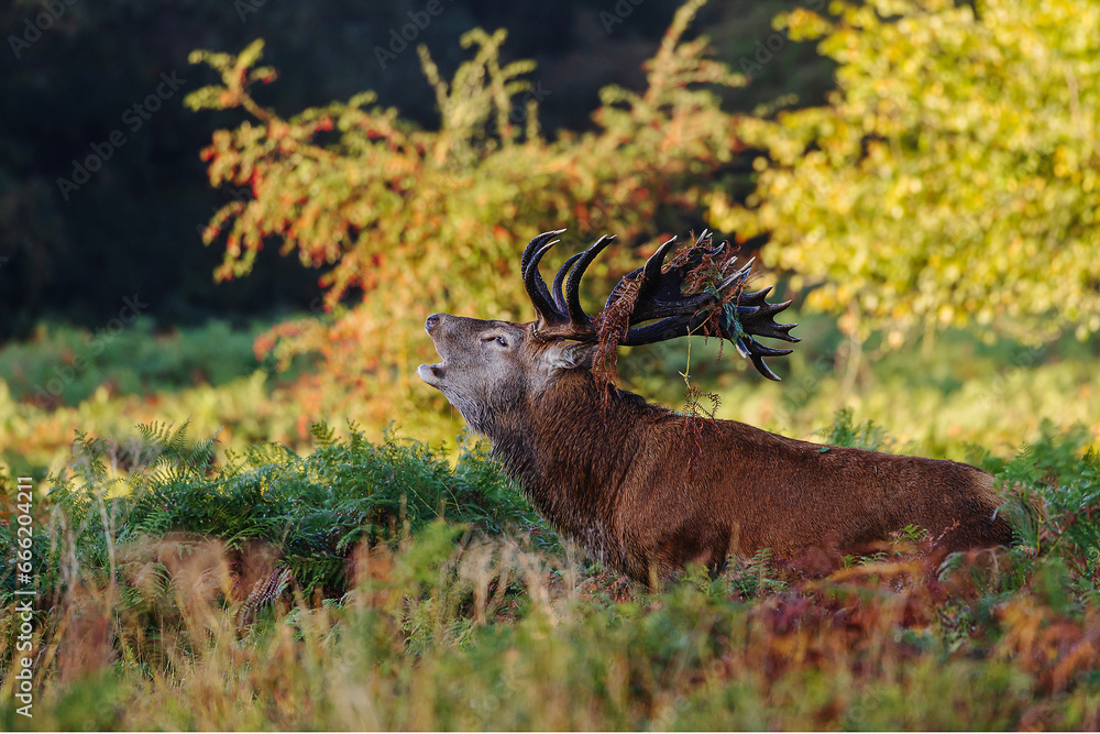 the red deer (Cervus elaphus) deer roars in rutting season in the ferns in the morning sun
