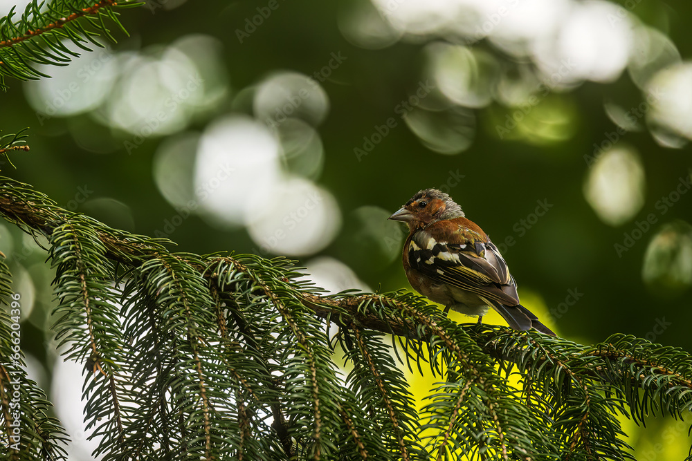 The Eurasian chaffinch, common chaffinch, (Fringilla coelebs) on a spruce branch