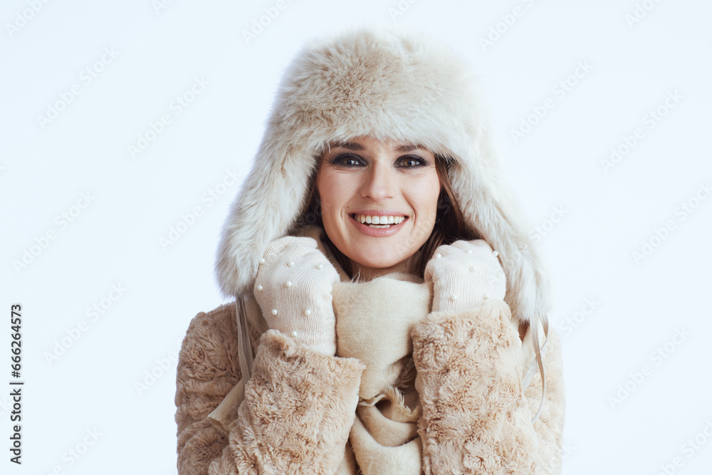 happy stylish woman in winter coat and fur hat on white