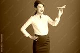 happy elegant flight attendant asian woman isolated on gray