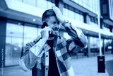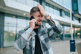 An upset young bearded man talks on his phone in the city, appearing worried. Worried Latin Man Engaged in a Serious Phone Discussion Outdoors