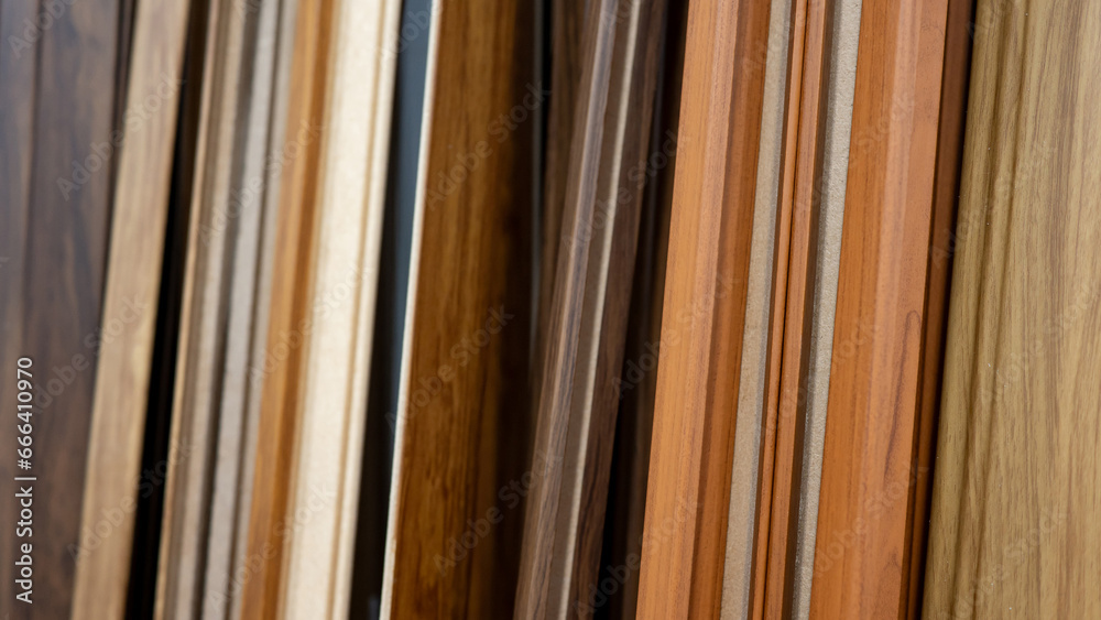 Sample of wood plank material in home design store. Wooden laminate floor finishing for house interior decoration