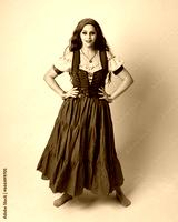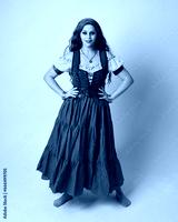 Full length portrait of beautiful red haired woman wearing a medieval maiden, fortune teller costume. Standing pose with dancing gestures, twirling skirt. isolated on studio background.