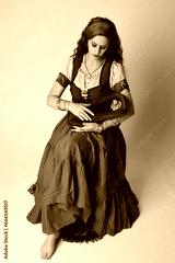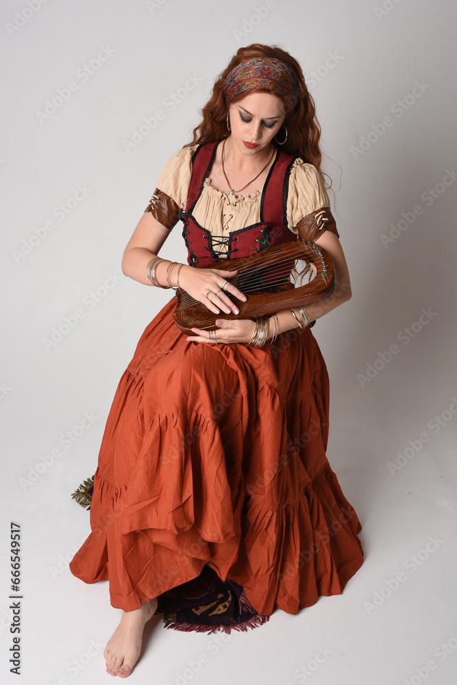 Full length portrait of beautiful red haired woman wearing a medieval maiden, fortune teller costume. Sitting pose, holding musical lyre instrument. isolated on studio background.