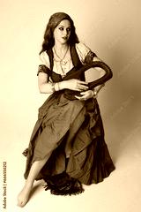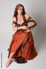 Full length portrait of beautiful red haired woman wearing a medieval maiden, fortune teller costume. Sitting pose, holding musical lyre instrument. isolated on studio background.
