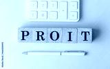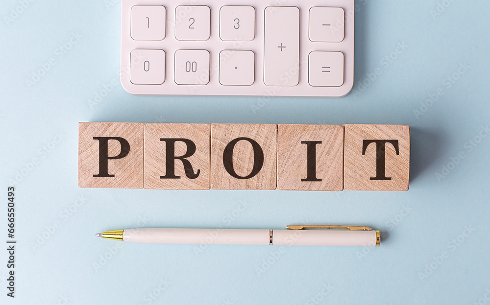 PROFIT on wooden cubes with pen and calculator, financial concept