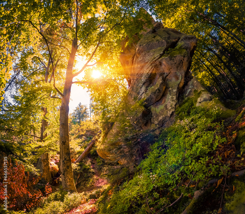 Amazing autumn scene of deep canyon in popular tourist destination - Protyati Kameni. Sunny outdoor sceneof Carpathian mountains, Ukraine, Europe. Beauty of nature concept background.