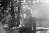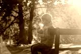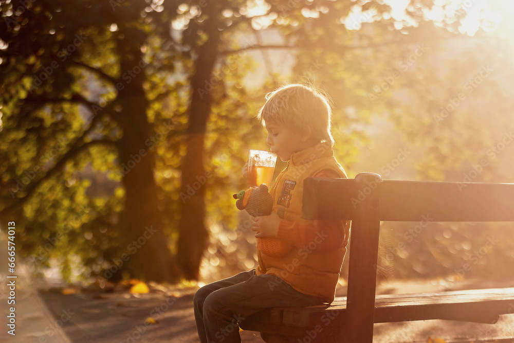 Beautiful blond preschool child, boy, sitting in the park in the morning sunrise, enjoying autumn weather, drinking tea and enjoying the sun