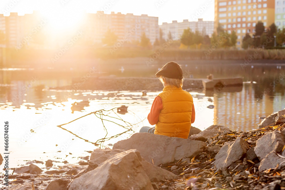 Beautiful blond preschool child, boy, sitting in the park in the morning sunrise, enjoying autumn weather, drinking tea and enjoying the sun