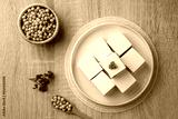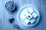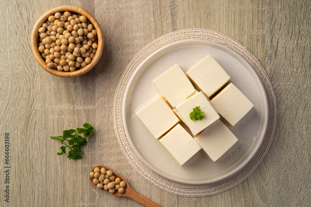 Fresh Sliced Soft Tofu soy bean curd on white plate.Top view