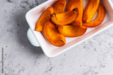Roasted pumpkin hokkaido in cooking pan, autumn healthy ingredient