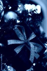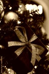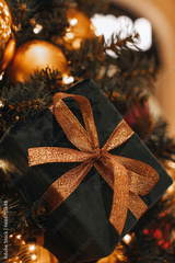 Velvet dark green wrapped present and Christmas surprise gift box with a golden shiny ribbon hanging on the Christmas tree.