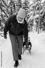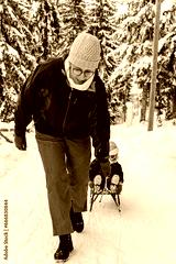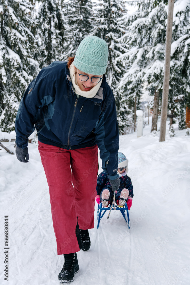 Little girl playing with mother on deep snow