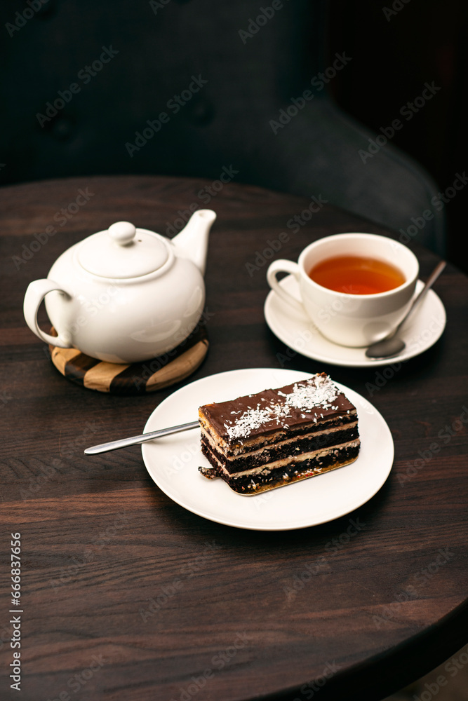 Tea in a teapot with cheesecake in a coffee shop on a wooden table.