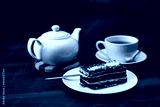 Tea in a teapot with cheesecake in a coffee shop on a wooden table.