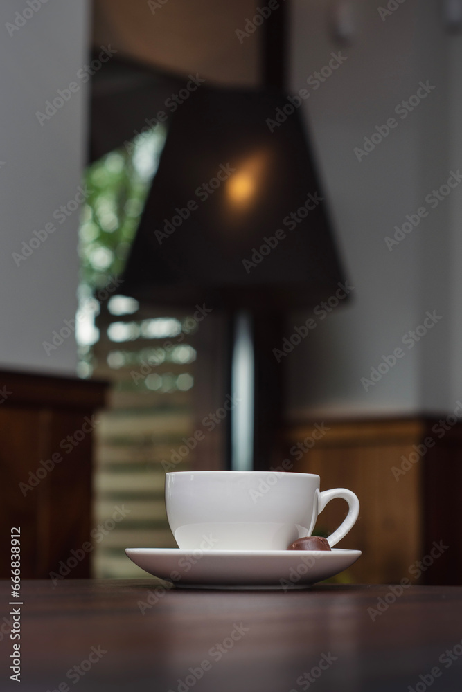 Coffee in a white cup with candy on a wooden table in a restaurant.