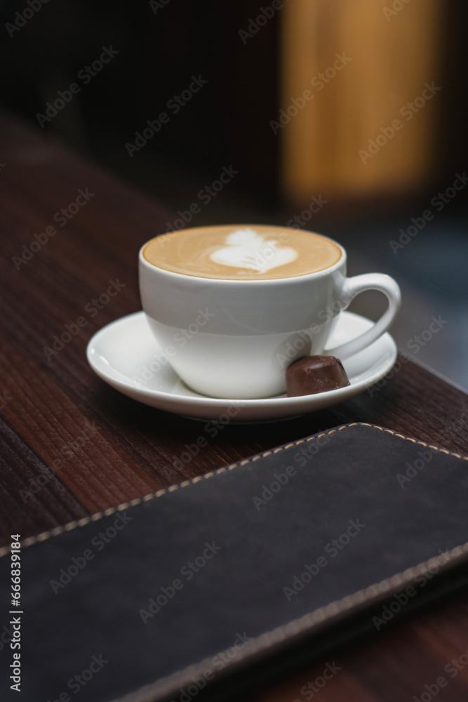 Coffee in a white cup with candy on a wooden table in a restaurant.