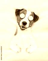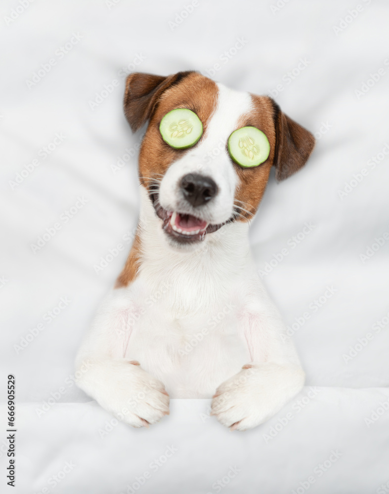 Funny jack russell terrier puppy with a piece of cucumber on it eyes relaxing on the bed at home. Top down view