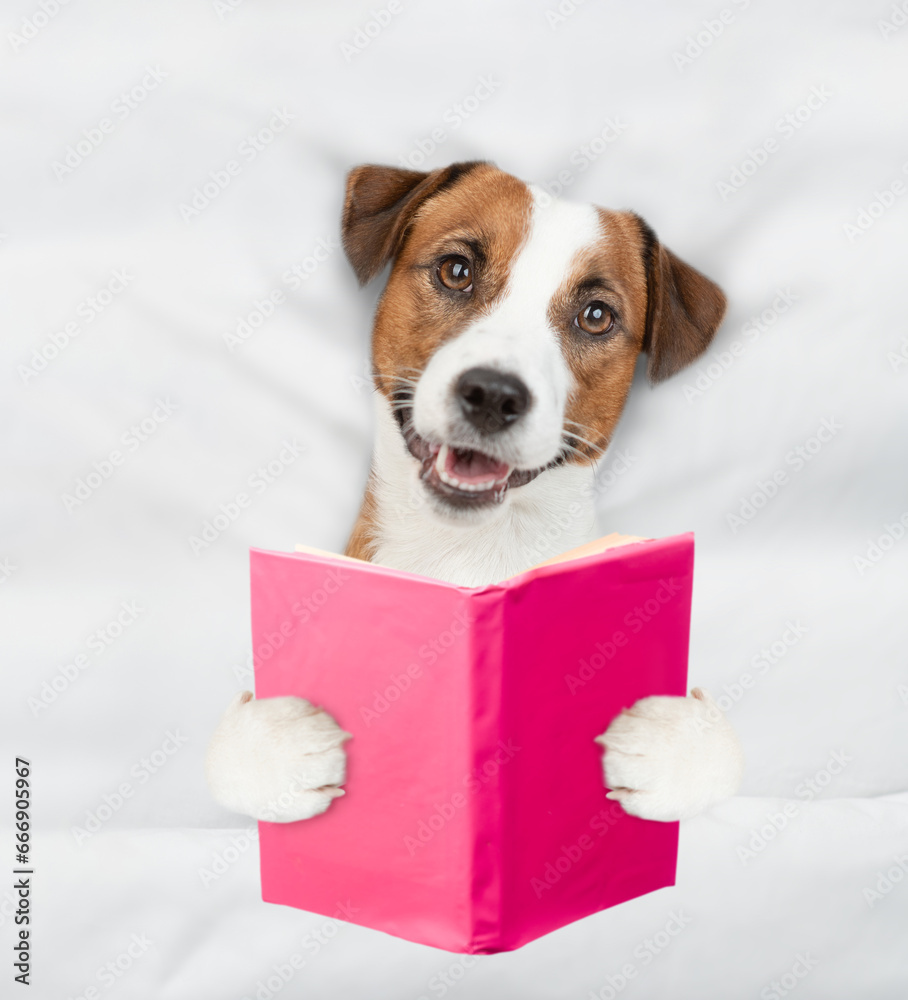 jack russell terrier puppy reads a book on a bed at home before bedtime