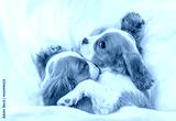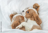 Two Cavalier King Charles Spaniel puppies sleep together on a bed at home. Top down view