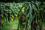 Dragon fruit trees in a garden waiting to be harvested on agriculturist farm in Asia Dragon fruit garden in Thailand Natural outdoor orchard.