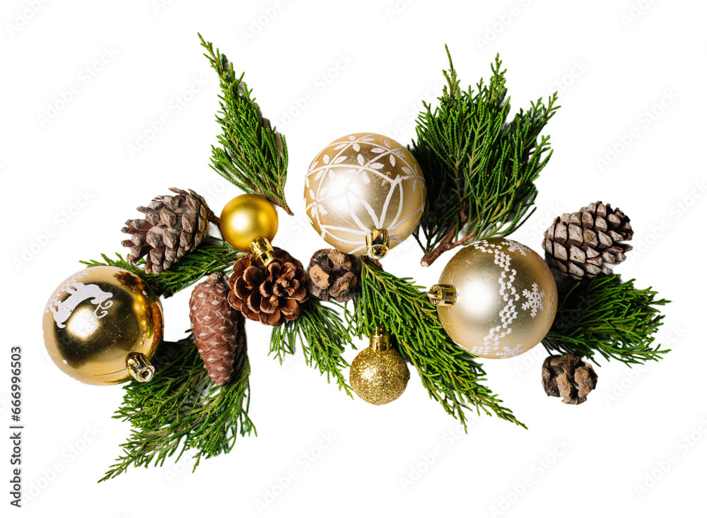 Christmas pine branches and ornaments balls, isolated on white or transparent background.