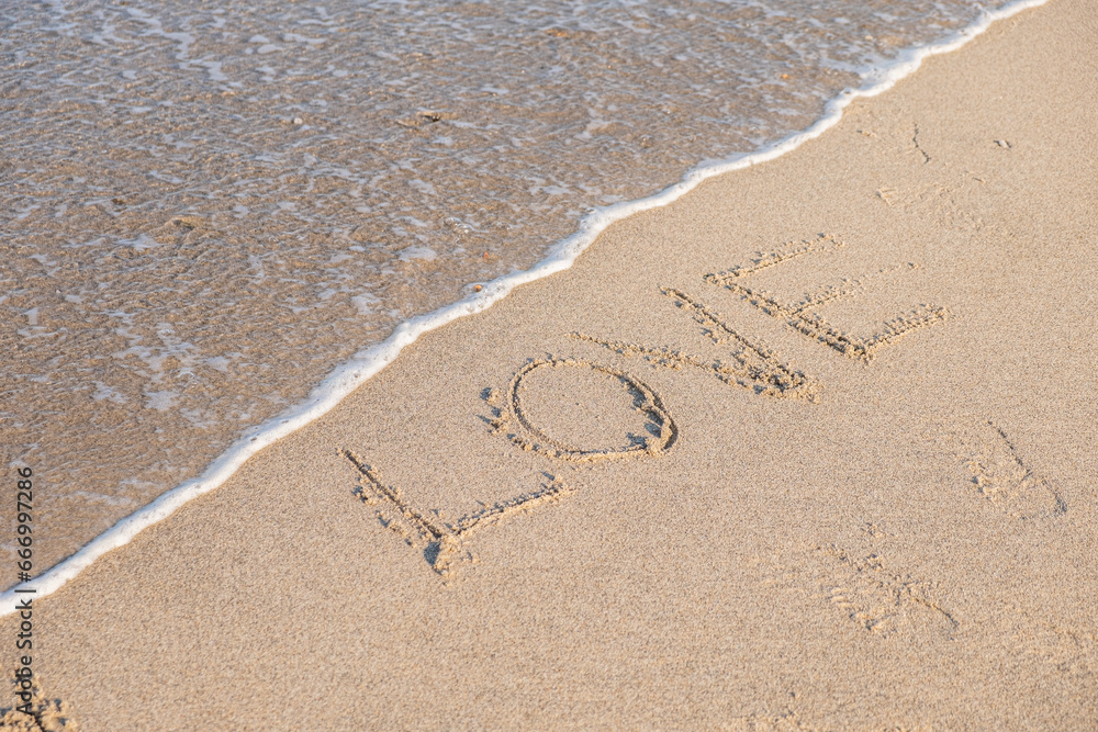 word love written in the sand of a beach. love concept