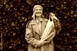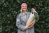 Woman with organic carrots and mesh bag against green leaf wall. Sustainable shopping without plastic packaging.