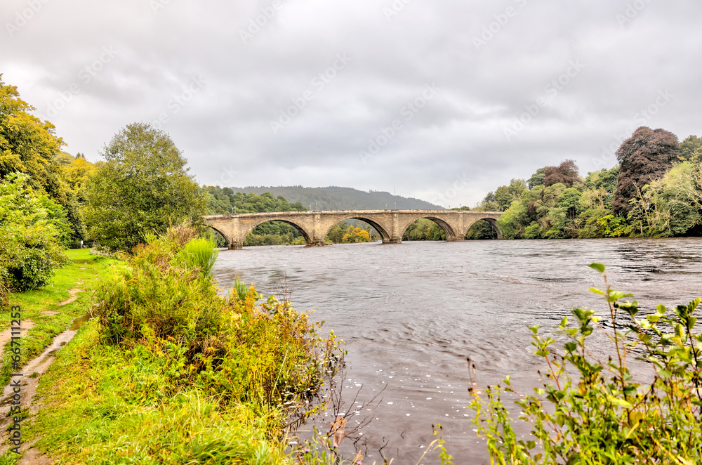 Dunkeld, Scotland - September 25, 2023: The ancient bridge over the Tay River in Dunkeld, Scotland