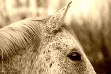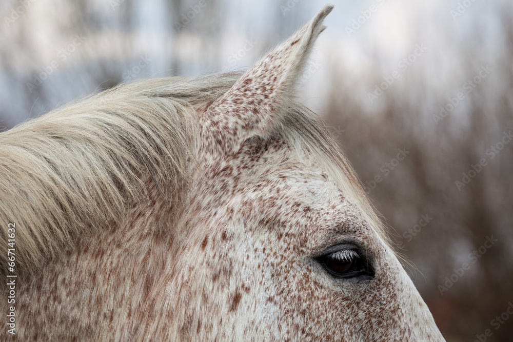 detailled close up of spotted white and brown horse head in front of trees