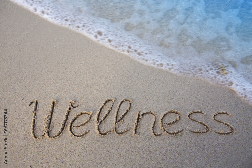 Word Wellness handwritten on the caribbean sand.