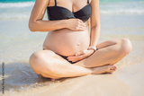 Expectant mother finds inner calm through meditation by the tranquil turquoise sea. A serene moment of pregnancy and peace