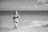 Radiant pregnant woman in a swimsuit, amid the stunning backdrop of a turquoise sea. Serene beauty of maternity by the shore